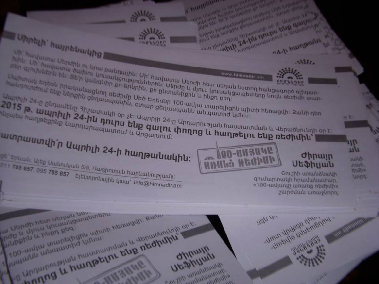 Նույնիսկ Ֆրանսիայի և Վատիկանի հատուկ ծառայությունների՝ ապրիլի 24-ին Հայաստան ժամանելու համար ՀՀ իշխանություններից անվտանգության երաշխիքներ պահանջելու մասին լուրերը Սեֆիլյանը փորձում է համարել կեղծ՝ այսպիսով համառորեն արդարացնելով ապրիլի 24-ին նախատեսված իրենց անընդունելի միջոցառումը: Ոչ միայն արդարացնում են, այլ նույնիսկ շարունակվում է թռուցիկների բաժանման գործընթացը, կոչ է արվում քաղաքացիներին՝ միանալ իրենց, ապավինել իրենց փրկությանը: