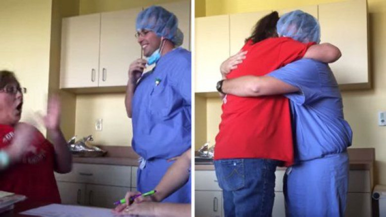 In the video above, you hear Hoffmaster, dressed fully in scrubs and a surgical mask, tell Glasure "I have a lunch appointment I need to get to so let's hurry up" with the chemo. She's taken aback at first, but when she realizes it's her son she freaks. "I haven't seen you for almost two years," she exclaims while crying.