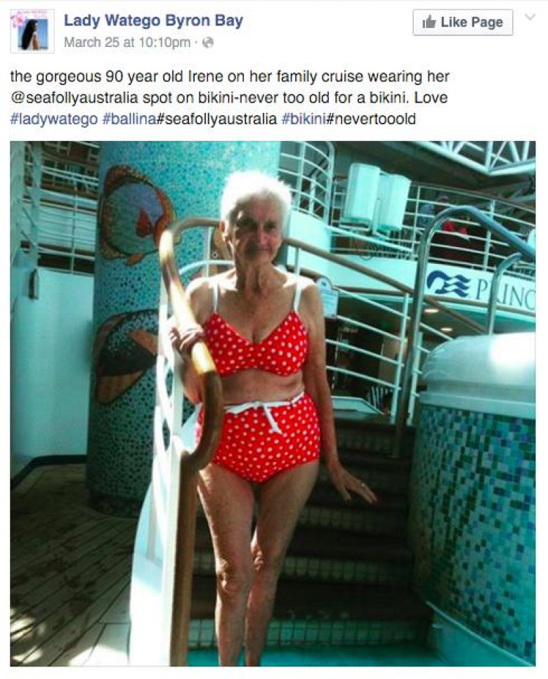 According to Australian swimwear company Lady Watego's Facebook page, Irene Carney, 90, came into their store looking for a bathing suit to wear on a family vacation. Though she didn't want to wear a bikini at first, her family told her she could totally pull it off and alas, she did. The above photo of her wearing her bikini on vacation is going viral.