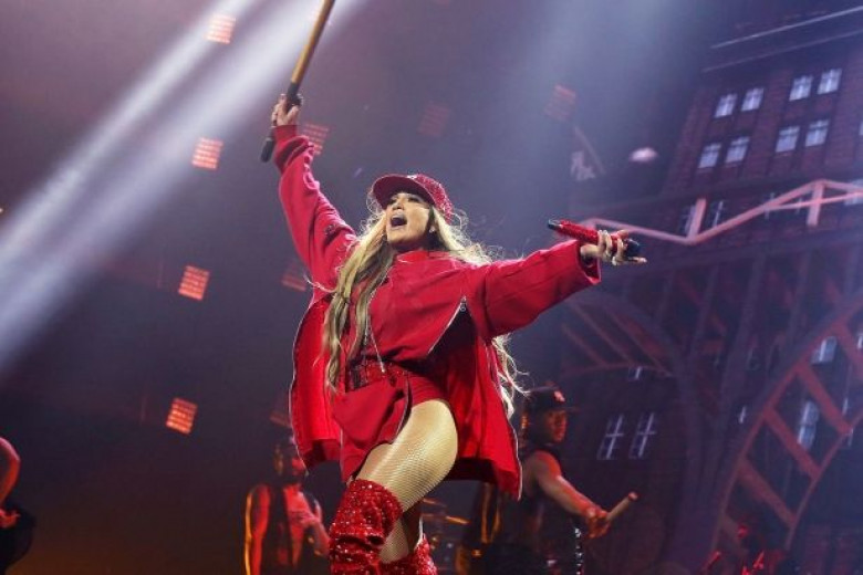 The star, who grew up in the Bronx, turned up the heat while performing her high-octane party hits in looks that flaunted her curves. Fishnet tights, high-waist latex briefs cinched by an embellished belt, and a matching embellished bra top—all in red by the way—ensured all eyes were on Lopez during her entire set at the Barclays Center.