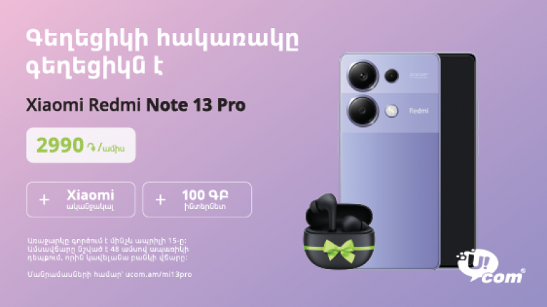 From March 4 to April 15, exclusively at Ucom sales and service centers, customers can purchase Xiaomi Redmi Note 13 Pro smartphone by paying a monthly installment of 2990 AMD. As a bonus, purchasers will also receive Xiaomi Redmi wireless headphones and a "nice" number, accompanied by the Level Up 1800 package. The first month under the tariff plan is complimentary, and a 100 GB of Internet will be provided, accessible for a duration of 6 months. The full retail price of the phone will be 143,500 drams.