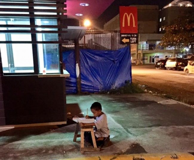Студентка Джойс Гилос Торрефранка, будучи в филиппинском городе Мандауэ, увидела вечером на улице мальчика, который делал уроки при свете витрины «Макдоналдса». Он сидел прямо на асфальте, а на принесенной с собой табуретке разложил тетрадку, в которой писал. Девушка сфотографировала прилежного мальчика и выложила снимок на своей страничке в Facebook