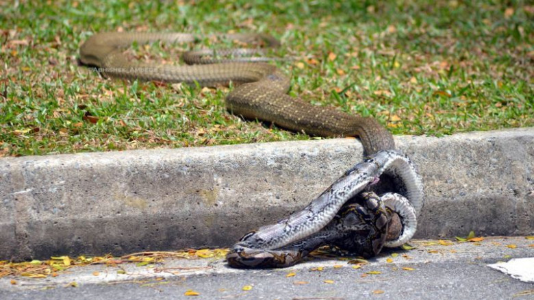 Студенты одного из сингапурских университетов стали свидетелями уникального поединка, завязавшегося между коброй и питоном. Схватка длилась около получаса, после чего кобра вырвалась из объятий питона и сбежала в кусты. Однако, перед этим она все-таки укусила своего врага, так что неизвестно, сколько он протянет.