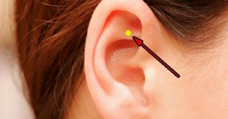 Эта точка расположена в верхней части треугольной ямочки уха, прямо над центральной частью со слуховым проходом.