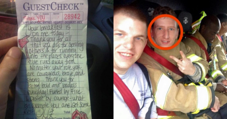 Подкрепившись, пожарные попросили у официантки счет. Каково же было их удивление, когда они увидели, что в чеке было написано: «Ваш завтрак сегодня за мой счет. Спасибо вам, ребята, за всё, что вы делаете. За то, что спасаете нас где бы то ни было и в любую минуту готовы примчаться на помощь. Без сомнения, вы мужественные и сильные парни. Спасибо за ваш ежедневный труд!»