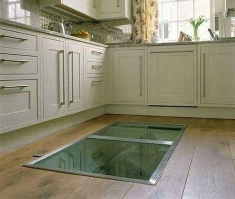 Когда впервые видишь это окно в полу, начинаешь думать, зачем оно там. Неужели это такая задумка архитекторов или просто какая-то деталь в стиле сюрреализма? Или там находится кладовая? А может окно там оказалось по ошибке? Или это очередная оптическая иллюзия? В голову приходят всё новые и новые варианты, и я не смогу спокойно заниматься своими делами, пока не узнаю, зачем на этой кухне в полу окно!