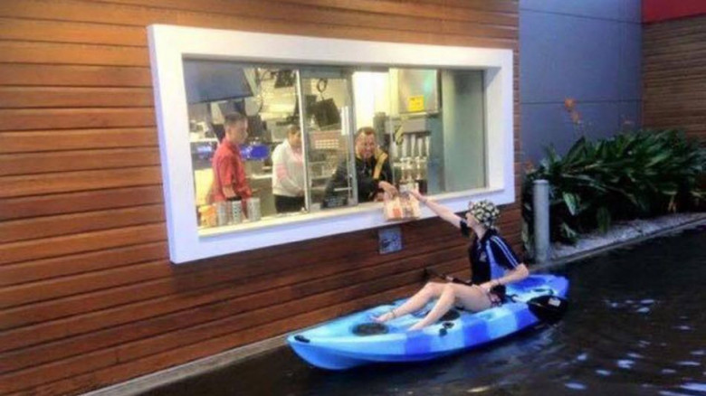 18-летняя Тамара Беркер, живущая в Австралии, очень сильно захотела поесть чизбургеров, и даже то, что все улицы затопило после многочасового дождя, никак ее не расстроило. Девушка запрыгнула в байдарку своей лучшей подруги и погребла к ближайшему McDonaldchr("39")s. Сотрудники общепита были в шоке, увидев, как к ним в окошко бьется девушка в байдарке.