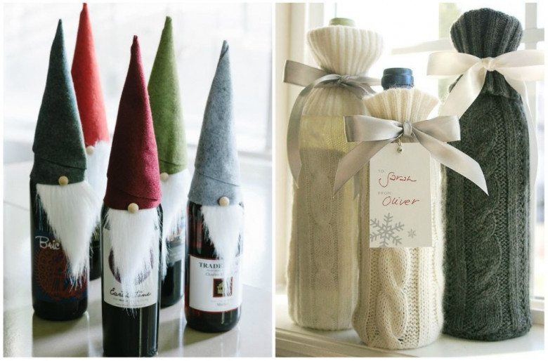 Бутылка хорошего вина сама по себе неплохой подарок. Но, украсив ее в новогоднем стиле, вы подарите еще и праздничное настроение. Вариантов украшения — огромное количество. Нам понравились милые шапочки из фетра и уютные вязаные чехлы из рукавов старых свитеров.