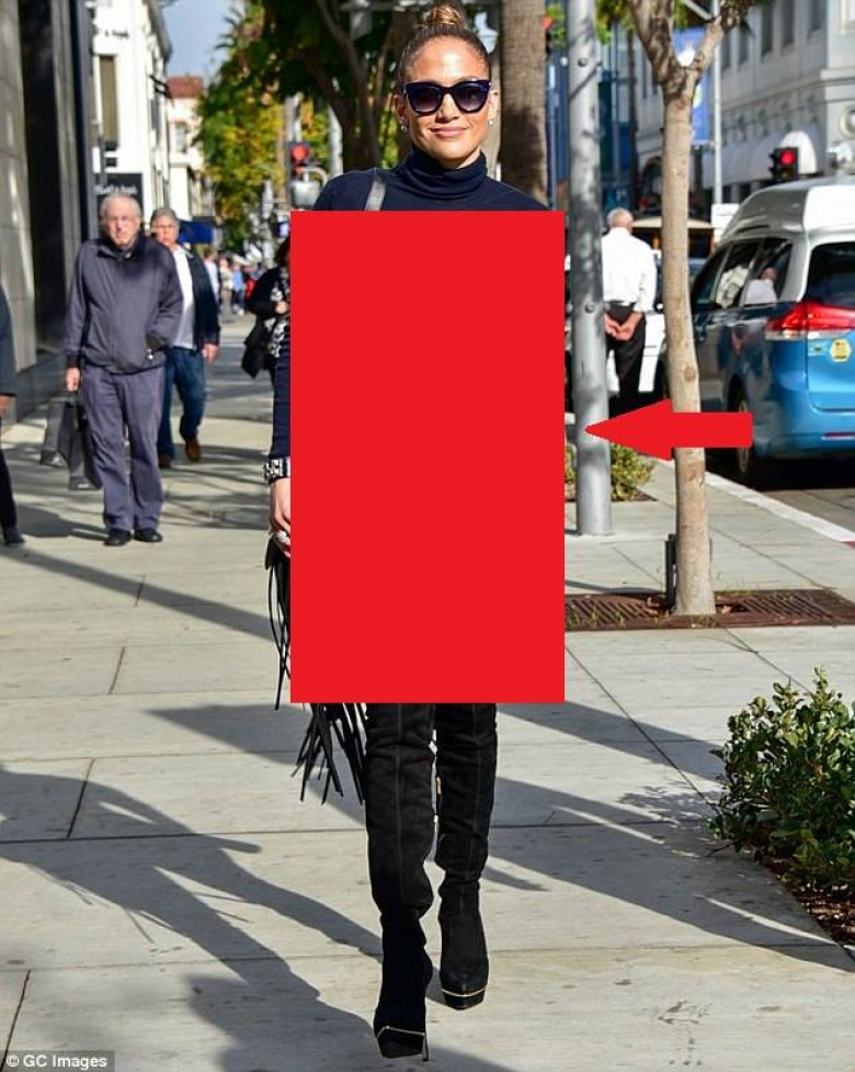 Figure-flaunting fashion: Clearly Jennifer Lopez was taking influence from her song, Booty, when she decided to showcase her famous derriere and incredible body during a relaxed Sunday stroll in Los AngelesSaucily understated: Opting for a casual yet racy look, the 46-year-old chart-topping pop queen made sure all eyes were on her as she sashayed down the sidewalk in a pair of skin tight jeans and semi-sheer roll neckRear-ing to go: Teaming the jumper with a pair of skintight denim jeans, which helped to further highlight her hour-glass figure, the New York native made sure her famous posterior was highlighted to the max