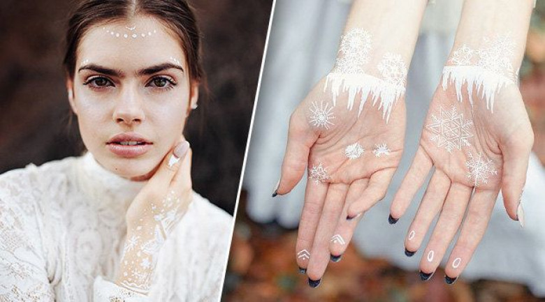 Белые флэш-тату могут напоминать и классические мехенди, которые обычно рисуют хной. Восточные узоры из моды никогда не выходили, так что смело экспериментируй с ними и зимой.