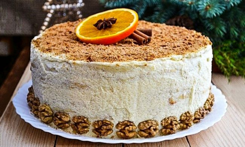 5. Сверху торт украсить измельченным печеньем или орехами. А для новогоднего настроения можно добавить палочки корицы, апельсин и звездочку аниса.