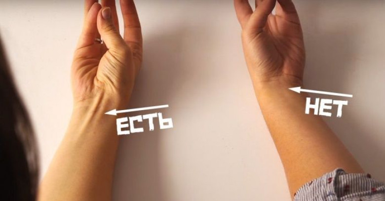 Проверить наличие длинной ладонной мышцы очень просто. Нужно сомкнуть большой палец и мизинец так, как показано на рисунке, а затем слегка согнуть кисть. Если возле сгиба запястья появляется бугорок сухожилия, значит, данная мышца у тебя есть.