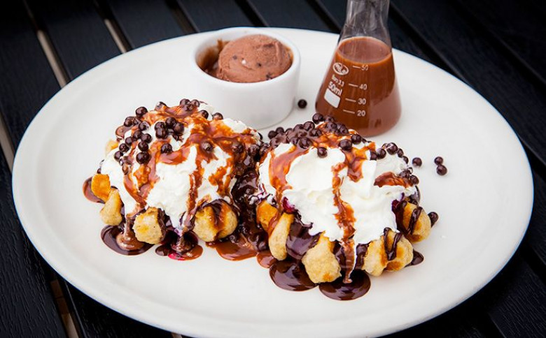 На тёплые вафли (2 шт) наливаем соус фуджи (растопленный шоколад, желательно тёмный), наливаем вишнёвое варенье — с ягодами, но ягоды должны быть без косточек,сверху делаем шапки из взбитых сливок, посыпаем вафельными шариками. Подаём с шариком мороженого и ганашем.