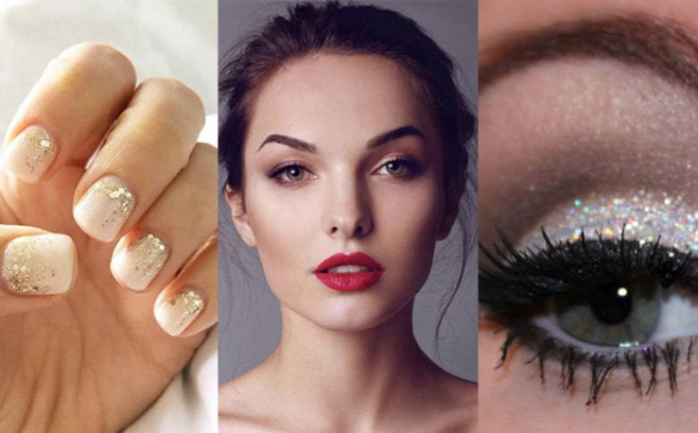 Нейтральный базовый тон и акцент из блесток, переходящих из обильного нанесения в едва заметное: супер-хит.