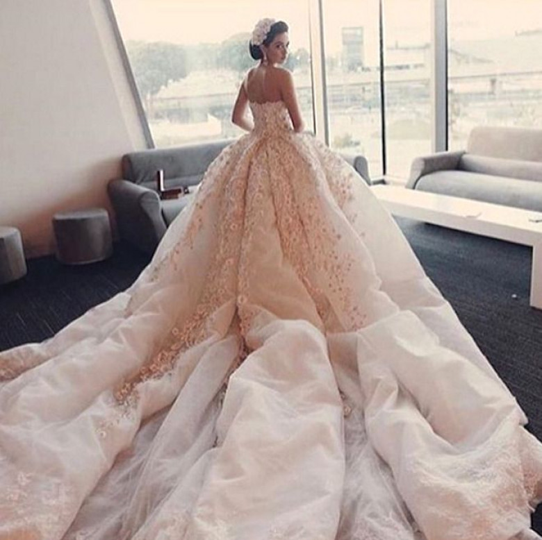 Платье невесты сразило гостей свей красотой. Оно было пошито на заказ именитым портным из Арабских Эмиратов. По оценкам экспертов, стоимость этого наряда превышает 6 000 евро.