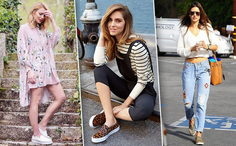 С чем еще носить слипоны? Смелые девушки могут примерить их с одеждой в бельевом стиле, например, с пижамным костюмом. Чтобы убрать ассоциацию с тапочками, выбирай модели из кожи, а также варианты с принтом и голографией.