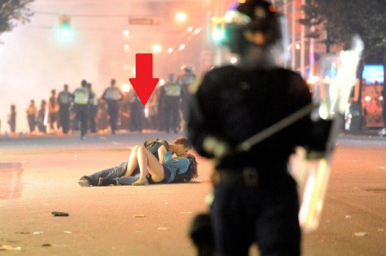 Этот снимок был сделан уже почти 5 лет назад – в 2011 году во время беспорядков в Ванкувере после того, как местная хоккейная команда проиграла финал Кубка Стэнли. Среди облаков слезоточивого газа и горящих полицейских машин фотограф Рич Лэм сделал фотографию, которая облетела весь мир: лежащую на дороге посреди всего этого хаоса целующуюся парочку.