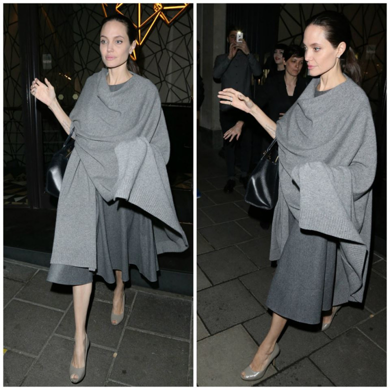 25 апреля Анджелина Джоли была замечена около одного из ресторанов Лондона, куда отправилась на ужин с известным политиком Уильямом Хейгом. Пока одни обсуждали возможную причину встречи голливудской звезды и бывшего министра иностранных дел Великобритании, другие заинтересовались нарядом актрисы. В этот вечер Анджелина Джоли изменила своему любимому черному, выбрав комплект серого цвета.