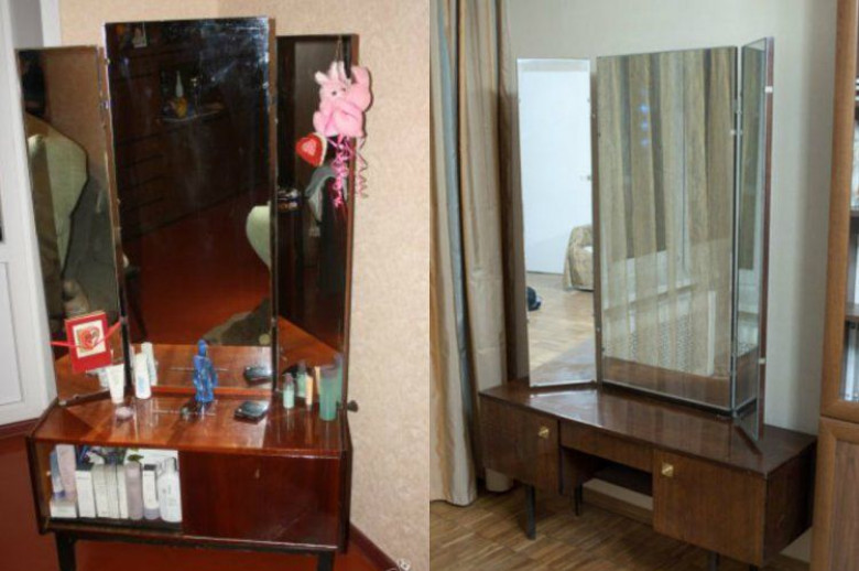 Еще один похититель свободного места – трельяж на ножках. Одни устанавливали его в прихожей, другие в зале, а некоторые – в спальне, если в квартире было больше одной комнаты.