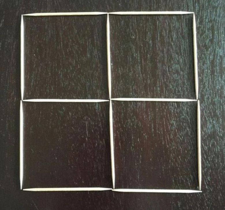 Итак, на картинке ты видишь 12 зубочисток, которые выложены в форме четырех квадратов. Необходимо за три хода сделать из них три квадрата, при этом за один ход можно перемещать только одну зубочистку. Ломать или еще как-то изменять форму инвентаря также нельзя. Дерзай!