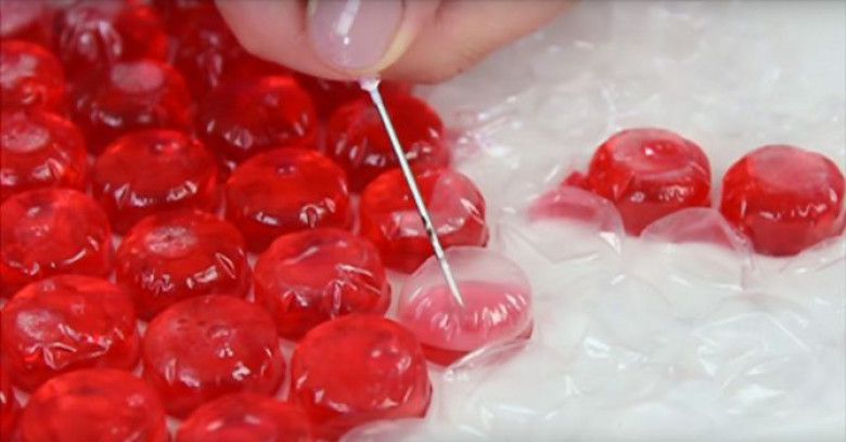 2. Когда желатин полностью растворится, возьми шприц и аккуратно заполни пузырьки пленки желатиновой смесью.