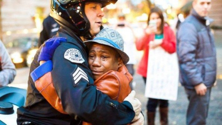 Полицейский обнимает плачущего мальчика