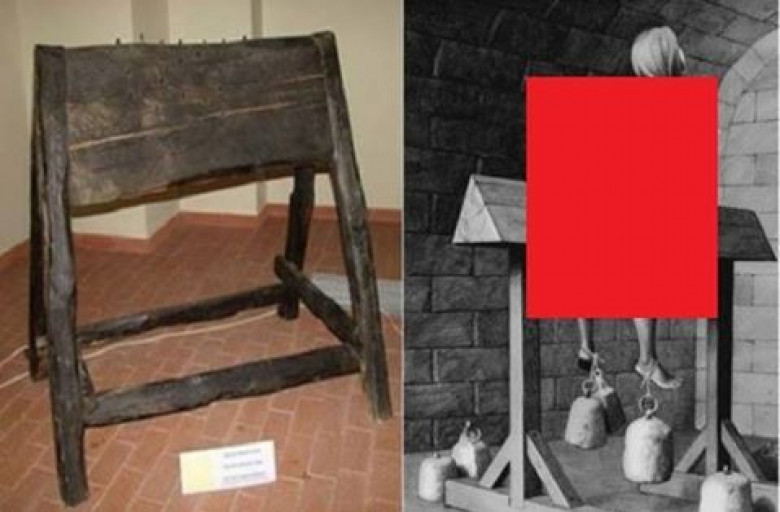 Треугольное бревно с шипами на подставке. Сверху сажается голый человек, которому к ногам привязывают утяжелители. А дальше беспощадная гравитация делает свое дело...