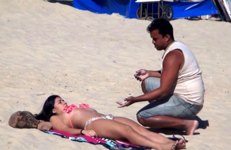 Смешной и весьма дерзкий розыгрыш от бразильских шутников. Идея розыгрыша заключается в том, что лежащая на пляже девушка просит случайных прохожих мужчин помочь ей намазать спину солнцезащитным кремом. Такой красотке трудно отказать, поэтому без долгих раздумий мужчины сразу же выхватывали крем из рук девушки. Радость от происходящего и грязные мысли тут же улетучивались из мужских голов, как только она переворачивалась на спину, чтобы те нанесли крем на переднюю часть её тела.