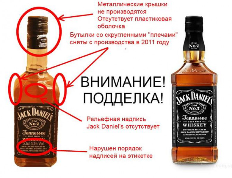 В последнее время распространение получил фальсификат Jack Daniel’s в новых бутылках. На первый взгляд подделка неотличима от оригинала, но всё-таки несколько признаков есть: