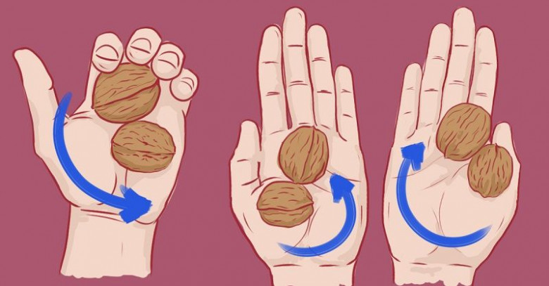 - В каждую ладонь возьми по 2 ореха и делай ими круговые движения.
