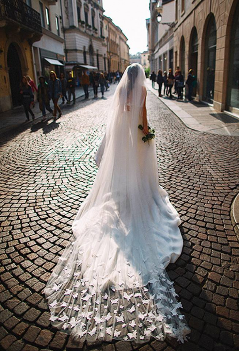 Итоговый вариант платья я увидела лишь за две недели до свадьбы, когда полетела его забирать, а фату - лишь за день до церемонии, когда моя мама героически закончила расшивать ее бабочками, которых было около 300 штук.