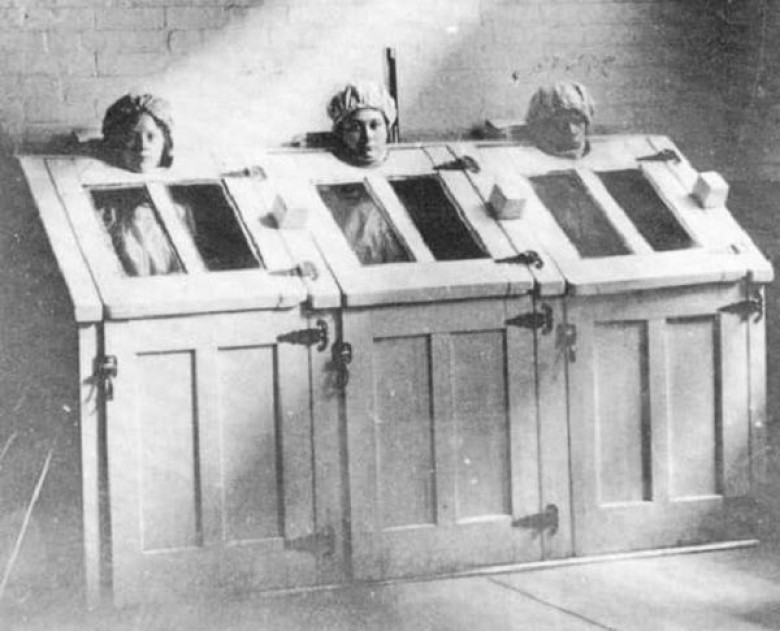 Эти странные ящики на самом деле успокоительные паровые кабины конца XIX века. Они просто выглядят зловеще, а так ничего страшного в них нет. Психиатры считали, что такая «парилка» может успокоить буйного пациента. Но если ты заметил, больные сидят в парилках полностью одетыми. Вряд ли это было очень приятно и сказывалось на буйстве.