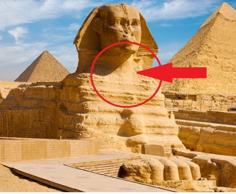 Существуют предположения, что первоначально сфинкс имел голову льва, а человеческая голова вместо нее была высечена гораздо позднее, что объясняет нарушение пропорций между гигантским телом и маленькой головой.