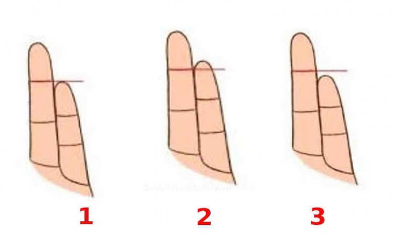 Смотрите с тыльной стороны ладони. Кончик мизинца доходит до линии, отделяющей верхнюю фалангу безымянного пальца? Или он короче, или, может быть, длиннее?