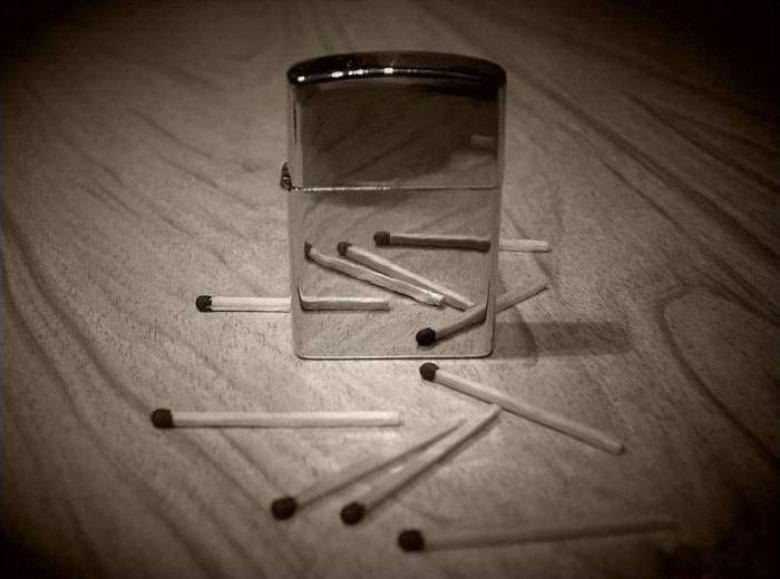 А на самом деле для этого фото понадобилось 7,5 (семь с половиной) спичек! Дело в том, что спичка, которая лежит за зажигалкой справа внизу, не сможет уместиться целиком. Для того чтобы не упереться в зажигалку, необходимо использовать только половинку спички.