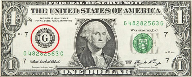 Здесь увеличительное стекло, к счастью, не потребуется. Хотя многие и не знают, что означает эта буква “G” слева от изображения Вашингтона, ее присутствию там есть логическое объяснение. Эта буква — одна из многих обозначений банков Федерального Резерва, ответственных за печать купюр. В данном случае “G” означает Чикаго.