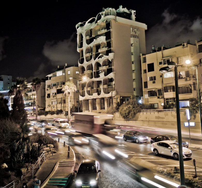 Местные жители называют его Сумасшедшим домом благодаря причудливым формам и деревьям, растущим прямо из окон. Это здание является жилым домом, расположенным на улице Ха-Яркон, и неизменно привлекает внимание всех направляющихся к морю.