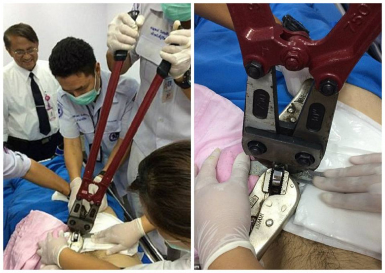 В итоге, чтобы справиться с кольцом, тайские хирурги принесли в операционную гигантские ножницы по металлу. Наверное, ни один мужчина не сможет смотреть без содрогания на то, как этим полуметровым инструментом врачи щелкают прямо возле того, что любой представитель мужского пола считает самым дорогим. Важность пострадавшего органа понимали и сами врачи - и поэтому прежде, чем приступить к разрезанию металла, проложили между его лезвиями и кожей пациента металлическую пластину.