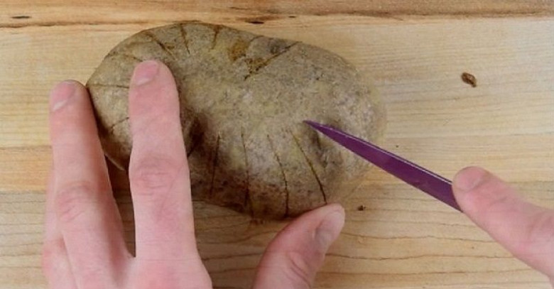 1. Срежь небольшой слой клубня так, как показано на фото. По бокам сделай несколько вертикальных надрезов.