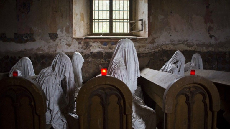 Гипсовые скульптуры художника Якубы Хадравы (Jakub Hadrava) в заброшенной Церкви святого Георгия в Чехии. Скульптуры были установлены в 2014 году в память о живших в этих краях судетских немцах. В этом году церковь посетили около 2500 туристов со всего мира.