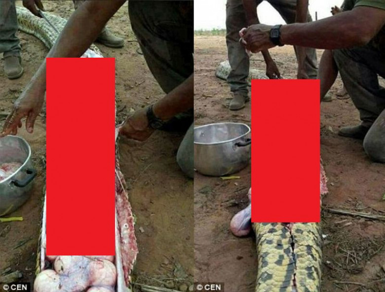 Разъяренные жители одной из нигерийский деревень убили огромную змею с опухшим животом, подозревая, что она съела теленка. Однако разрезав пресмыкающееся, они обнаружили несколько десятков яиц, которые считаются редкими деликатесами.