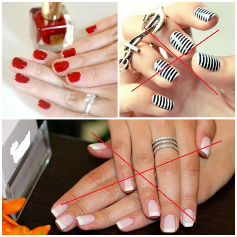 Графичный маникюр в тренде и неплохо смотрится на коротких ногтях, но единственное, чего вам следует избегать — это горизонтальные полосы. Они «режут» ноготь, создавая впечатление, что ногтевая пластина вытянута не в длину, а в ширину. Не айс!