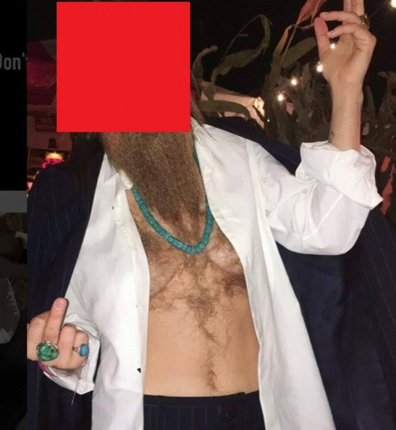 Одна из трех непутевых дочерей Брюса Уиллиса и Деми Мур - Скаут Уиллис - ради костюмированной вечеринки перевоплотилась в брутального мужика с бородой и грудью нараспашку. Откуда взялись волосы для тела, история умалчивает.