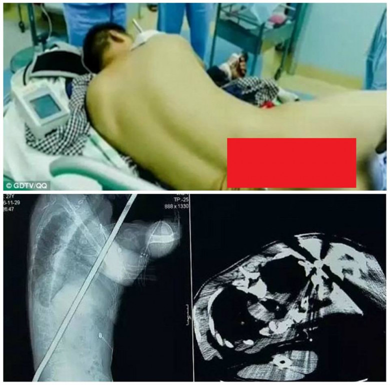 Несчастный случай произошел в Китае. Полутораметровый громоотвод, упавший с высоты седьмого этажа, насквозь пропорол мужчину, работавшего на стройке. Металлическая трубка ударила в плечо и вышла наружу в районе талии. Операция по удалению громоотвода и восстановлению жизненно важных функций организма длилась около 3 часов.