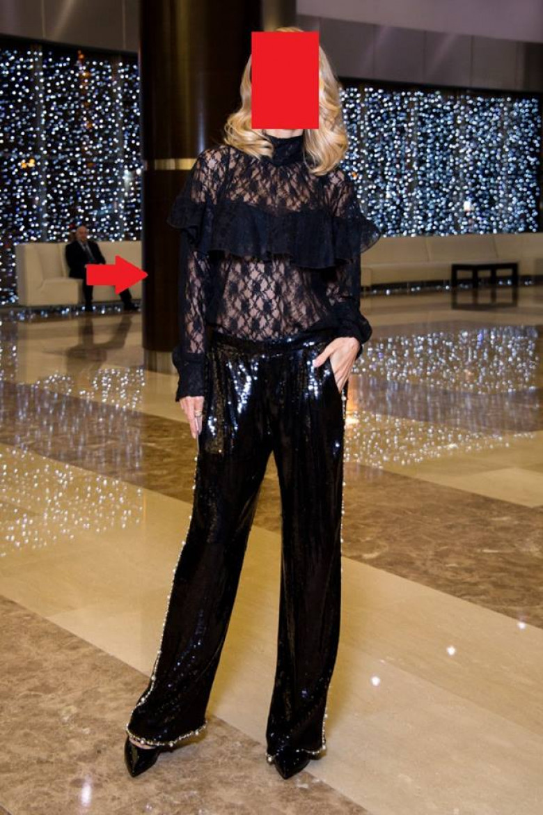 Для вечеринки по случаю 37-летия Эмина Агаларова Светлана Лобода выбрала несколько странный наряд. Певица надела свободные брюки, расшитые черными пайетками, и дополнила их прозрачной кружевной блузой в тон с воланами на груди.