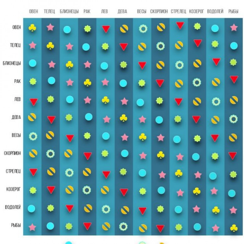 Пары, формирующие союз, обозначенный в таблице желтым цветом, на редкость гармоничны и долговечны. Часто они понимают друг друга с полуслова ввиду того, что их характеры и взгляды на жизнь во многом схожи. В таких семьях ссоры —  редкое явление.