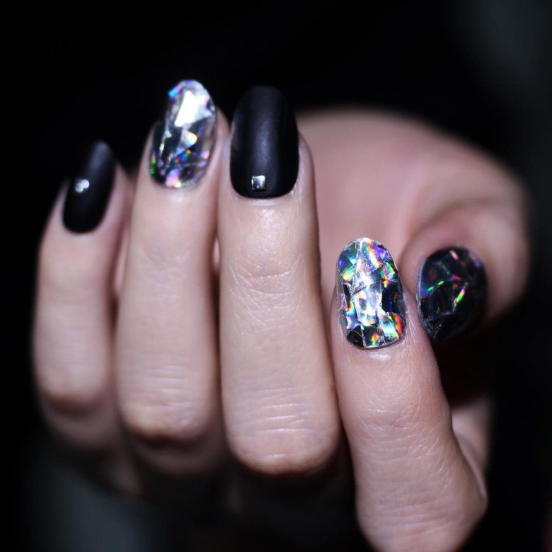 При создании такого маникюра используются мелкие кусочки фольги, которые фиксируются на ногтевой пластине с помощью бесцветного лака. Однако мы не рекомендуем повторять этот нейл-дизайн в домашних условиях. Чтобы все получилось аккуратно, лучше обратиться к любимому нейл-мастеру.