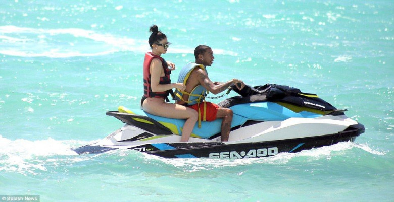 Hes the man: The pair also hopped on a jetski for a quick spin - Kylie holding onto Tyga as he took control of the vehicle