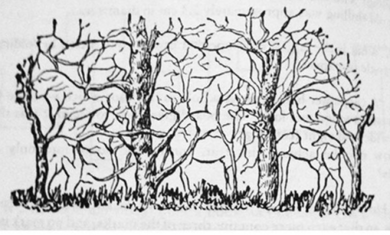 Взгляните на эту картинку. На первый взгляд, на ней изображены четыре деревца. Однако если вы приглядитесь, вы увидите, что в картинке спрятаны животные. Давайте начнем наш тест!
