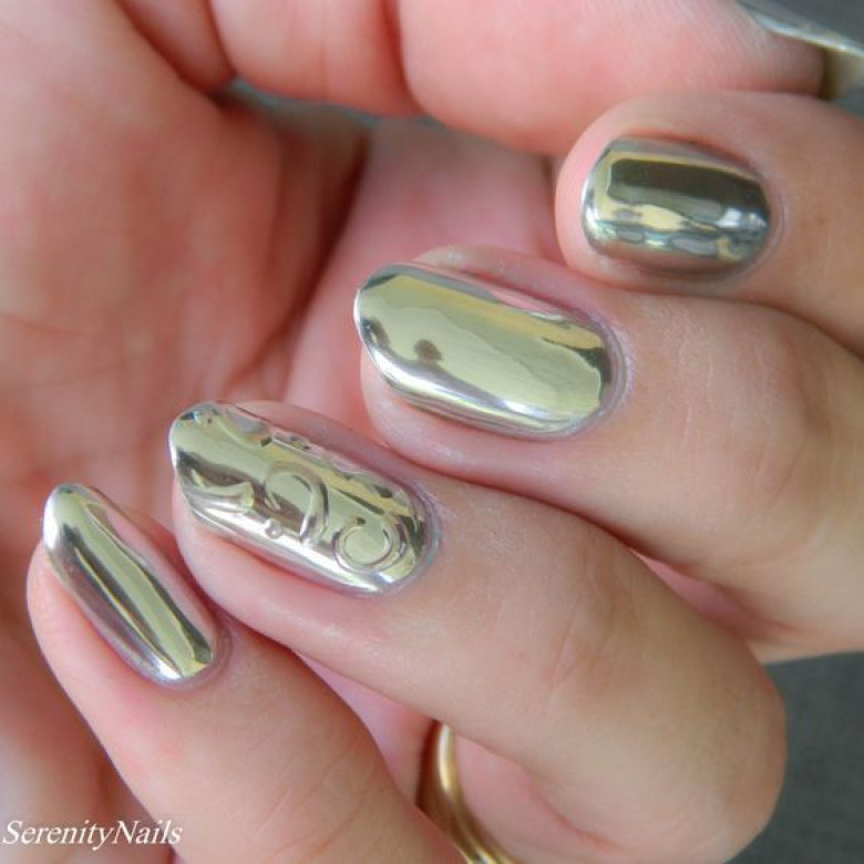 Как правило, зеркальный маникюр создается двумя способами. Если ты решишь сделать его самой, то нужно найти подходящий лак, не с блестками, а именно гладкий металлик. Подводный камень состоит в том, чтобы нанести покрытие особым образом — максимально ровно, не оставляя полосок и разводов.